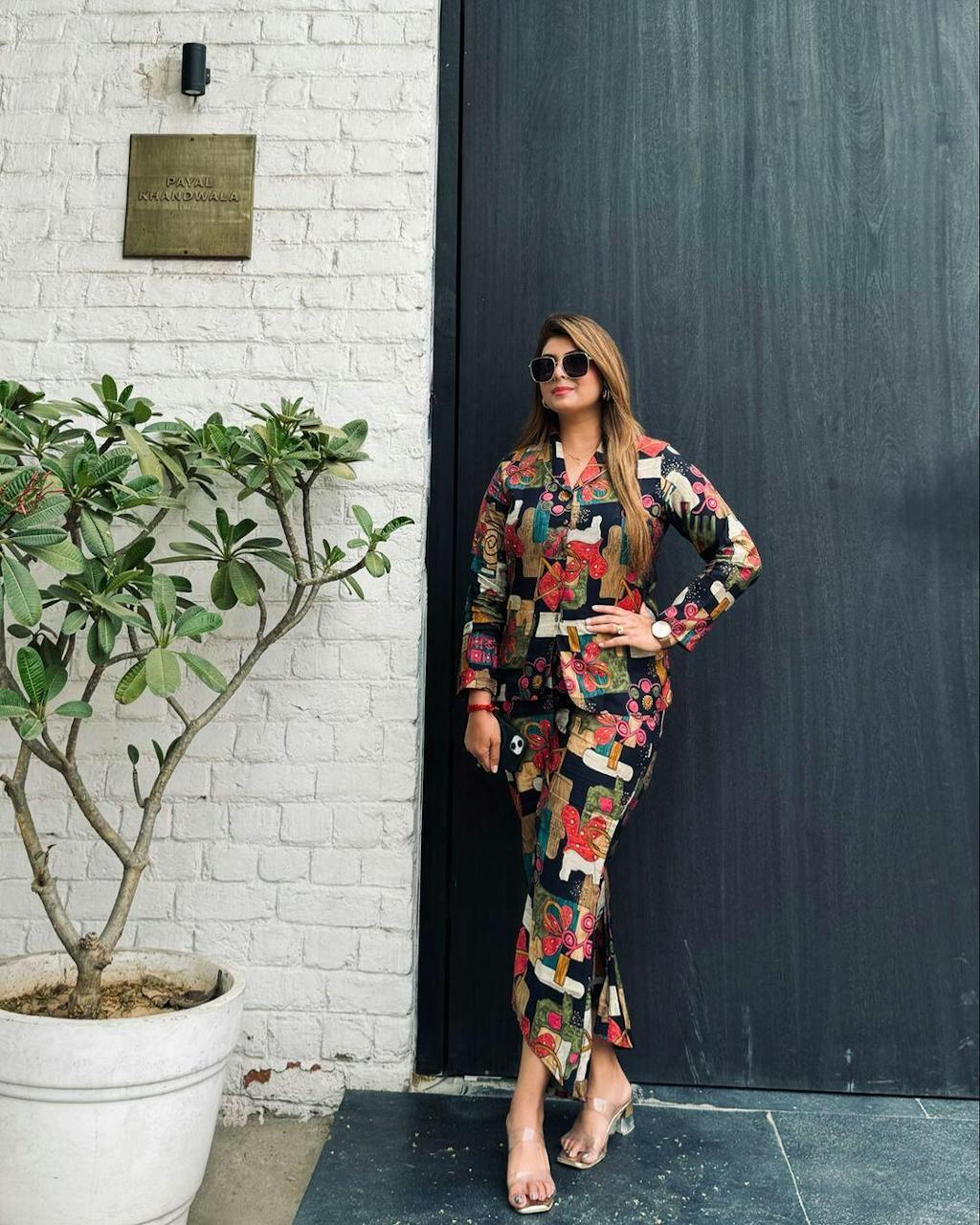 This stunning Co-Ord Set for Women in black features a sophisticated abstract print. Crafted from soft, lightweight Chanderi Silk, it promises all-day comfort and a breathable feel. The outfit includes a tailored button-down shirt and stylish straight-fit trousers, creating a chic, regular fit. It's the perfect ready-to-wear piece for everything from festive gatherings and office wear to stylish brunches or comfortable travel days.